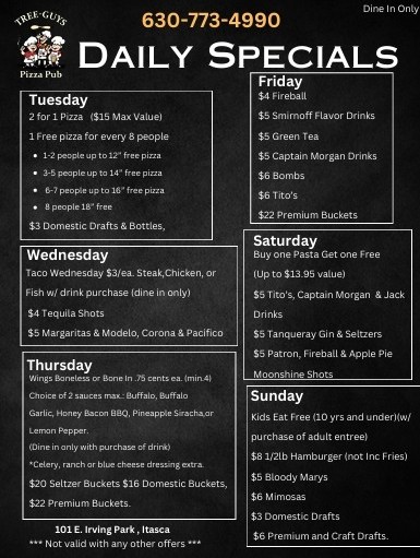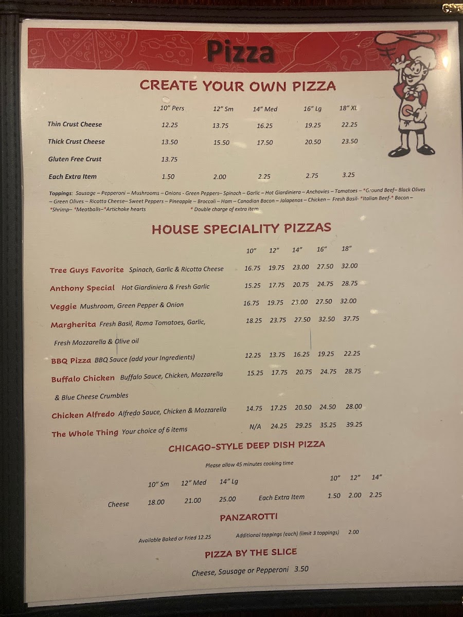 Welcome to Tree Guys Pizza Pub, where pizza lovers unite at 101 Irving Park Rd, Itasca, IL. This beloved local establishment sets itself apart with a varied menu that highlights their exceptional thin-crust pizza, which has received rave reviews from patrons. Diners consistently praise the delightful flavors and excellent quality of their pizzas, noting that every pie offers a unique taste sensation.